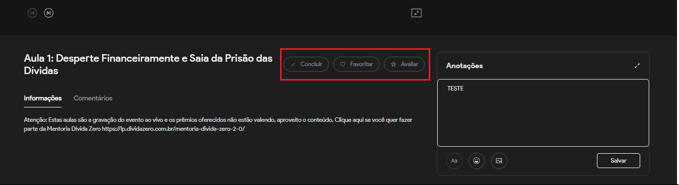 Dica: ao concluir uma aula, o sistema registra automaticamente o progresso.